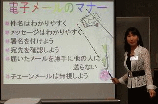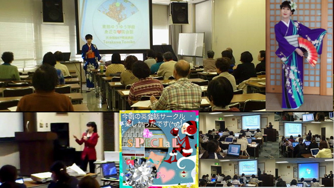 | 市民講座の各種英会話も担当 「ゆうゆう学級」「身近な英会話」担当時、 チャレンジ精神からパワポや和服で講義